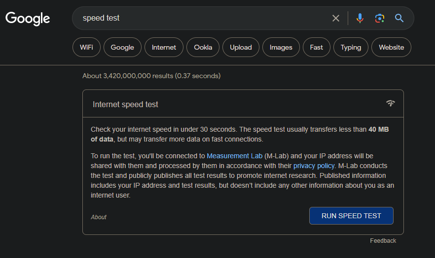 As you take photos in DigiMEP, these photos will try to upload immediately in order to prevent long upload times when the entire form is finished and uploaded all at once. If your photos won't populate the fields or if your form fails to upload completely, checking your internet connection is a fantastic place to start troubleshooting. To quickly check internet connectivity, open a web browser on your device and type in "speed test" into your search bar. You will be presented with an option to "Run Speed Test"