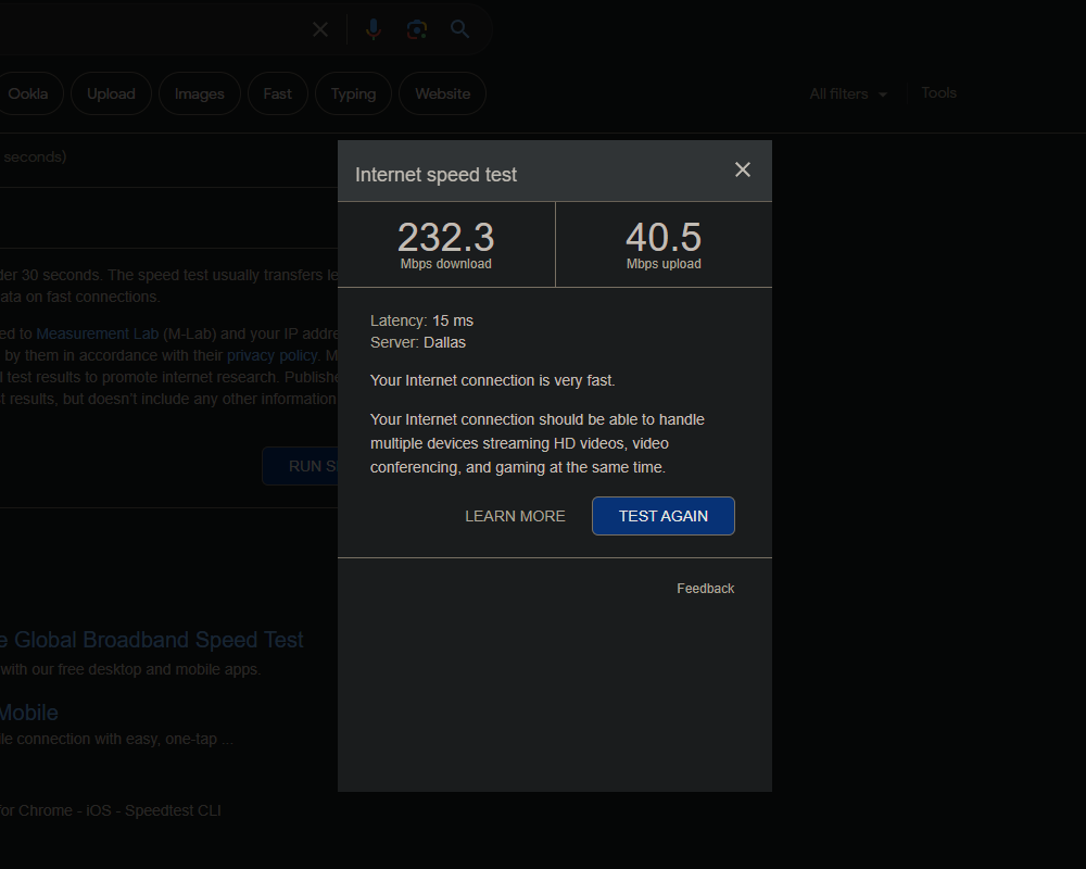 Tap the "Run Speed Test" button and wait for about 20-30 seconds. A pop up menu like this one will appear, displaying your current download and upload speeds.